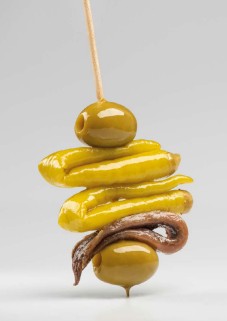 Guindilla de Ibarra con Eusko Label, aceituna verde deshuesada, anchoa en salazón, aceite, vinagre y sal.